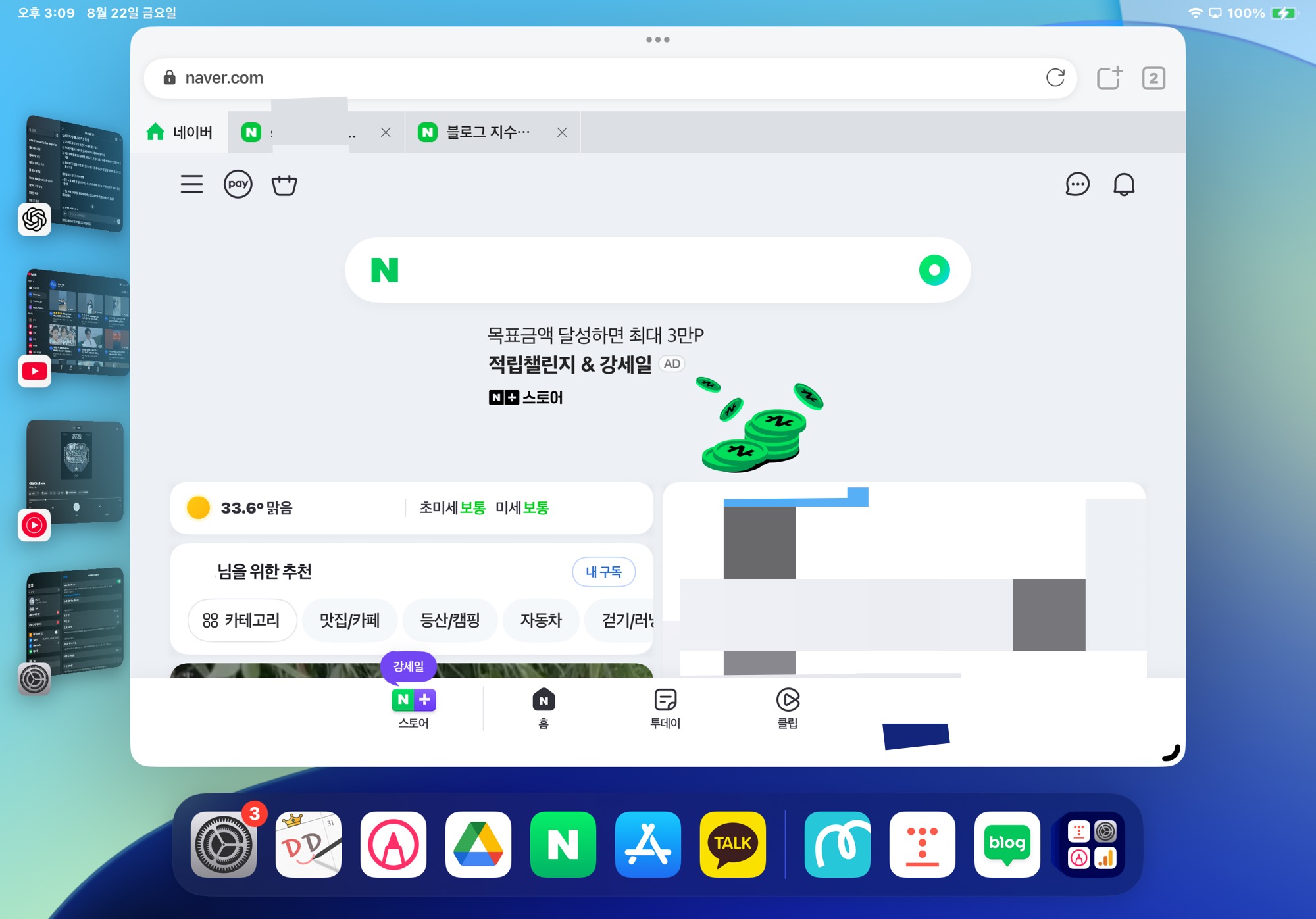→ 예: 아이패드 화면 = 블로그 원고 작성, 외부 모니터 = 참고자료, 이미지 편집 툴