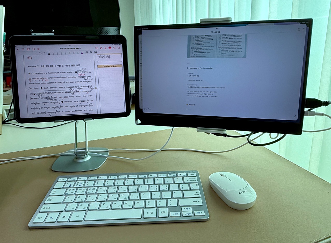 • 강의 준비: 아이패드 화면을 TV나 모니터에 띄워 학생들과 자료를 공유하니 가독성이 확실히 좋아졌습니다.